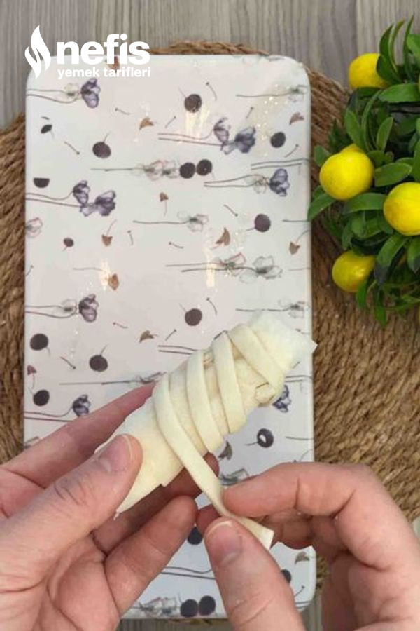 4. Milföy hamurunu ince şeritler halinde kesip, böreklerin etrafına doluyoruz.