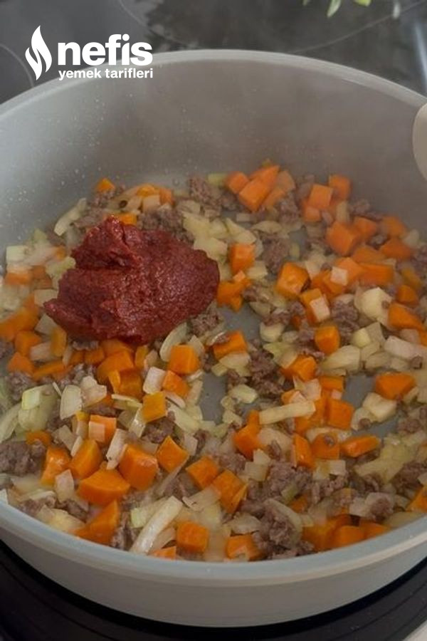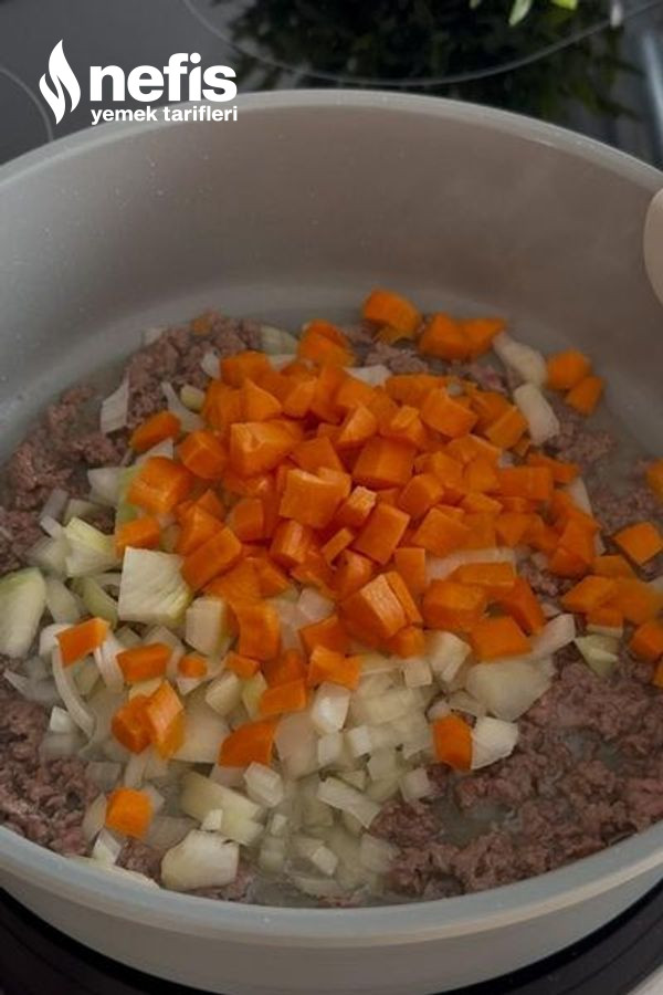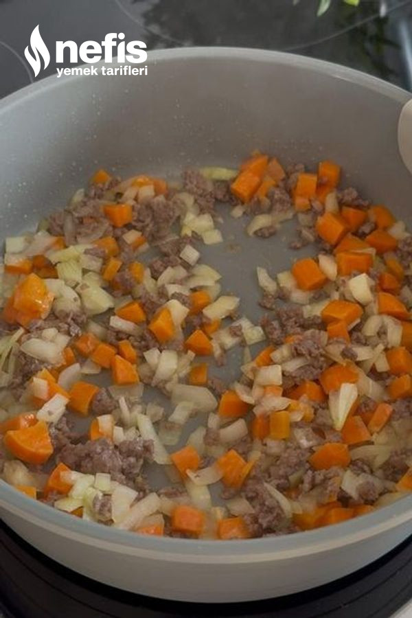 - Kıyma kavruldukdan sonra üzerine soğan ve havucları ekleyip kavuralım.