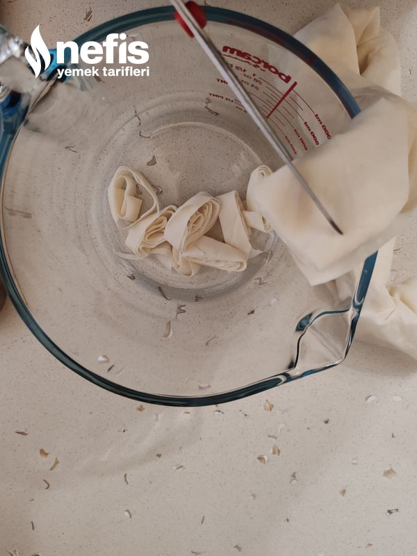 1. 1 yufkayı rulo haline getirip ince ince makasla yahut bıçakla keselim.