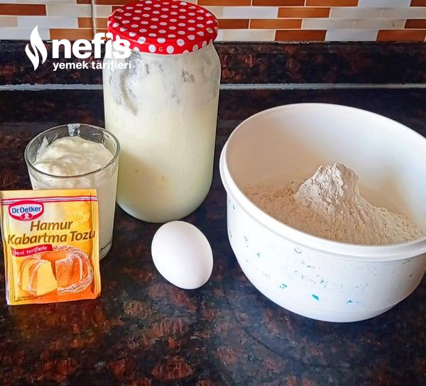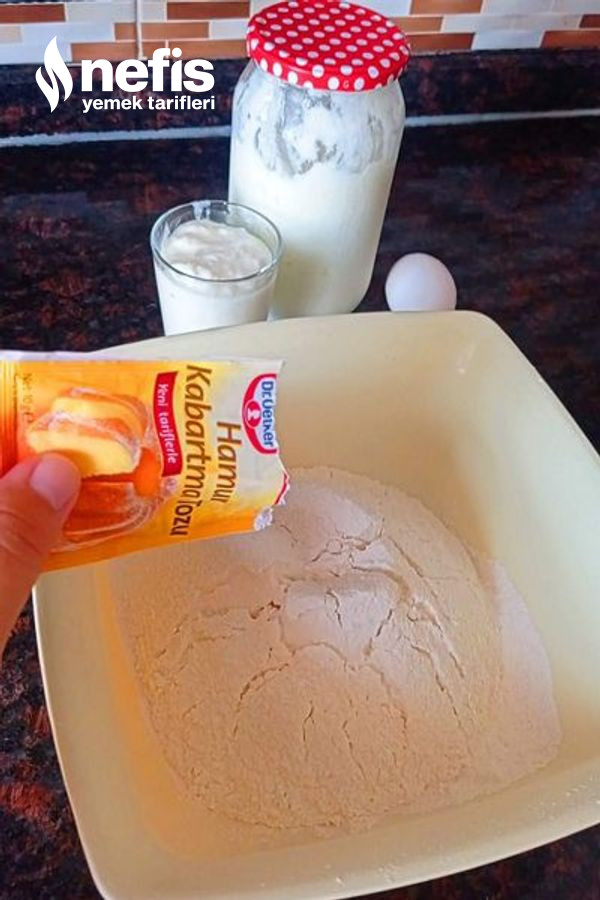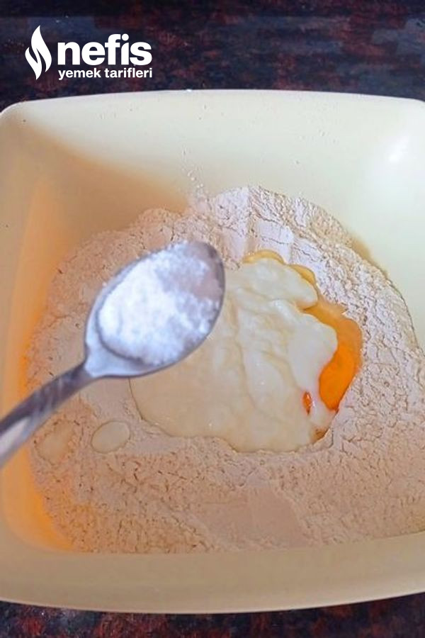 - Öncelikle uygun bir yoğurma kabına; un ve kabartma tozunu ekleyip karıştıralım daha sonra yumurta, yoğurt, tuz ekleyip elimizle yoğuralım yumuşak bir hamur elde edelim.