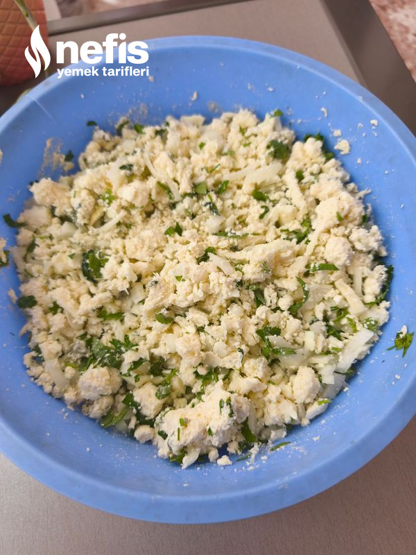 - O sırada iç gerecimizi hazırlayalım ,peyniri bir kaba alıp ezelim üzerine soğanı ve maydanozu doğrayıp karıştıralım.