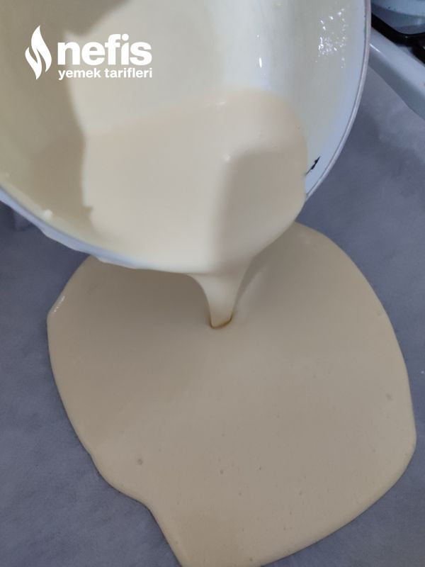 - Yağlı kağıt serilmiş fırın tepsisine krep hamurunu döküp eşit biçimde yayıyoruz.