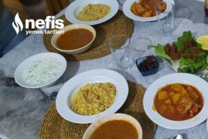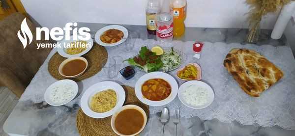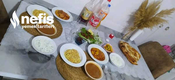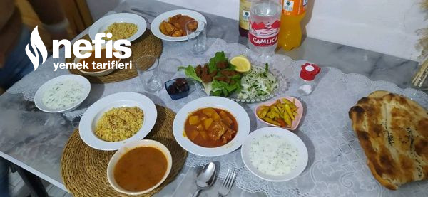 2 Gün İftar Sofram Etli patates yemeği Tel şehriyeli bulgur pilavı Arpa şehriye çorbası Cacık Soğan salatası Çiğ köfte Biber turşusu Hurma Pide 3 çeşit içecek İlginizi Çekebilir:Dev Bisküvi Pastası
