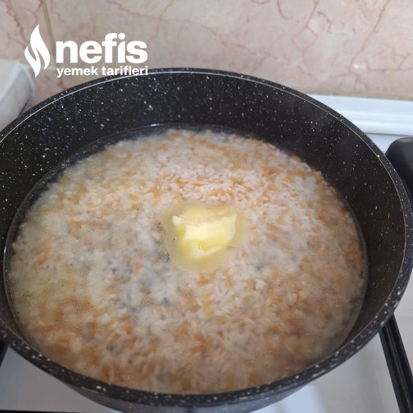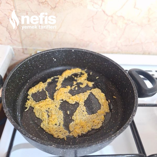 2. Yıkayıp biraz ılık suda beklettiğimiz pirinçleri şehriyelerin üstüne ekliyoruz.