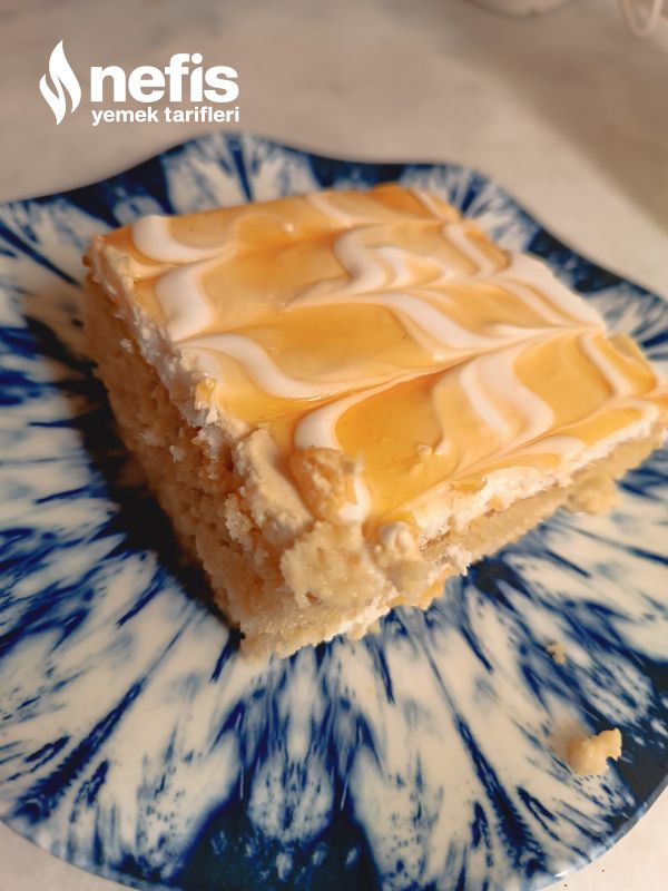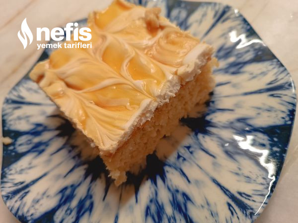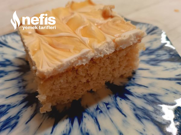 8. Soğuk süt ve krem şanti yeterlice çırpalım, soğuyan kekin üstüne yayalım.