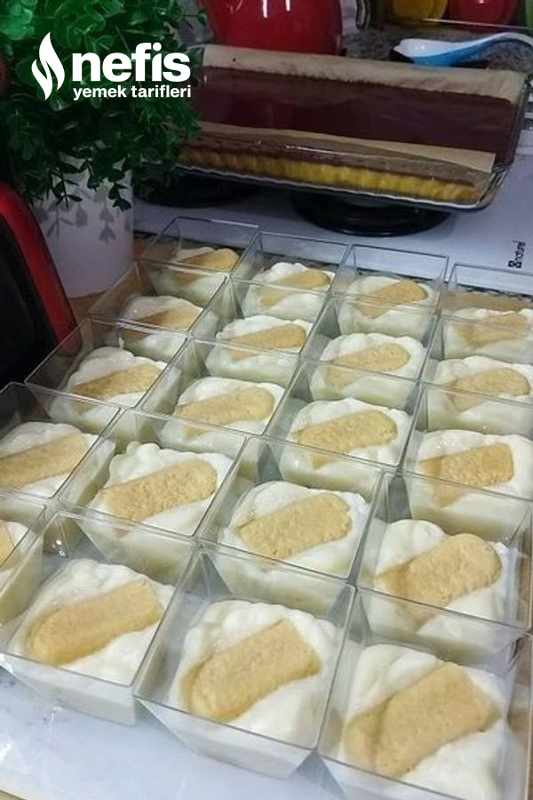 6. Daha sonra kedidilini ortadan bölüp süte batırın cupların tabanına bir tane koyup krema dökün.