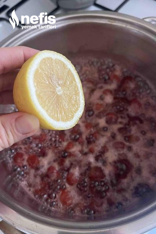 - 7 dk sonunda yarım limon sıkıyoruz, limonuyla bir arada 8 dk tutuyoruz ve çilek reçelimiz hazır.