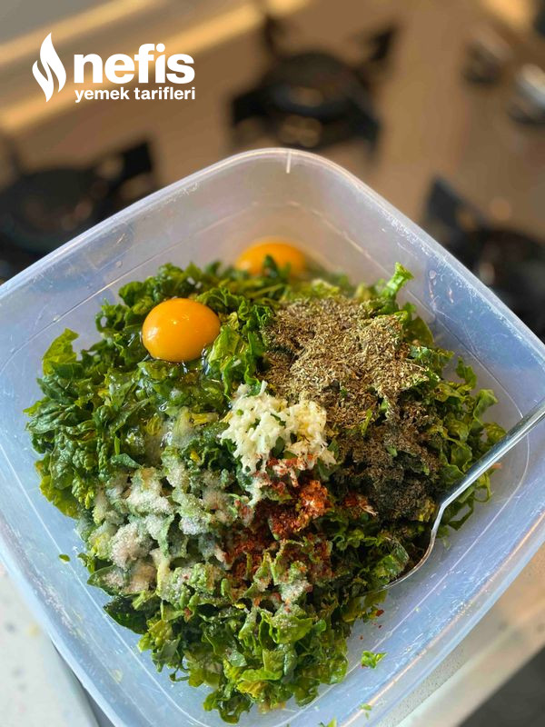 - Doğradığımız yeşilliklerimizin üzerine yumurta sarımsak ve baharatlarımızı ekleyerek karıştıralım.