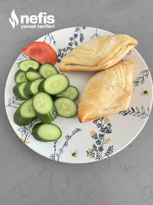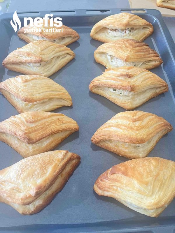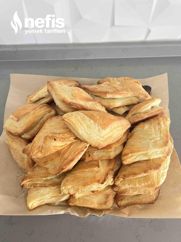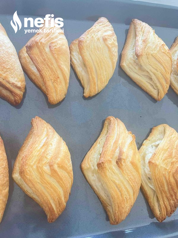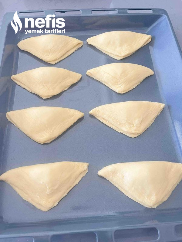 - Kestiğimiz dilimleri elimizle bastırarak kare formunda açıp iç harcımızı koyup iki köşesini kapatalım ve üçgen formunu verelim. Tepsimize dizelim. Üzerine kalan margarinden sürelim.