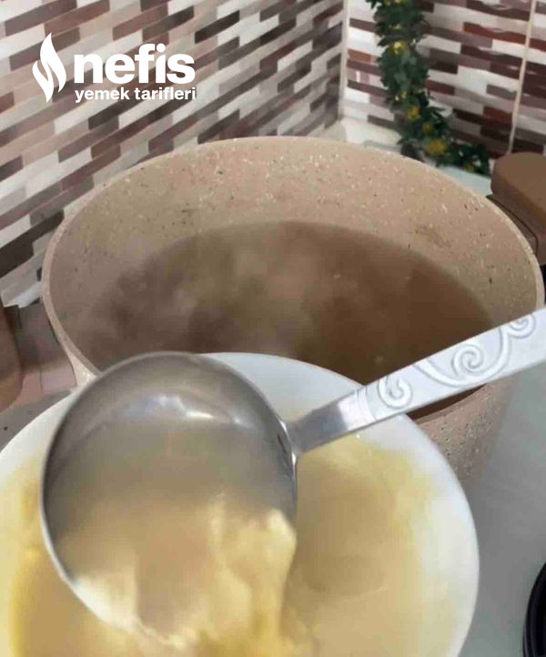 3. Ardından çorbanın suyundan bir kepçe alarak terbiyeye ekleyerek ılıtın ve yavaş yavaş terbiyeyi çorbaya ek edin.