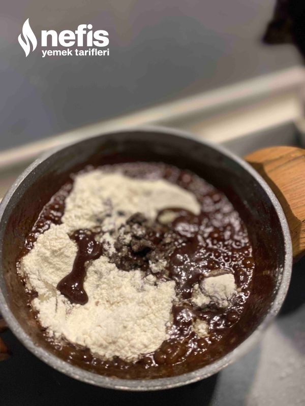 4. Çikolata eridikten sonra unumuzu da ek edelim karıştıralım.