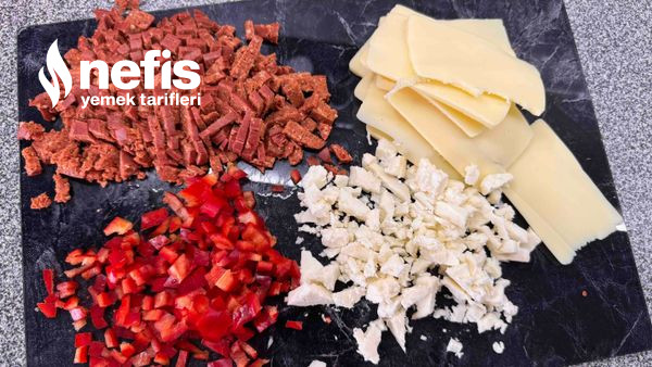 - Sucuk biber ve peyniri küçük küçük keselim.
