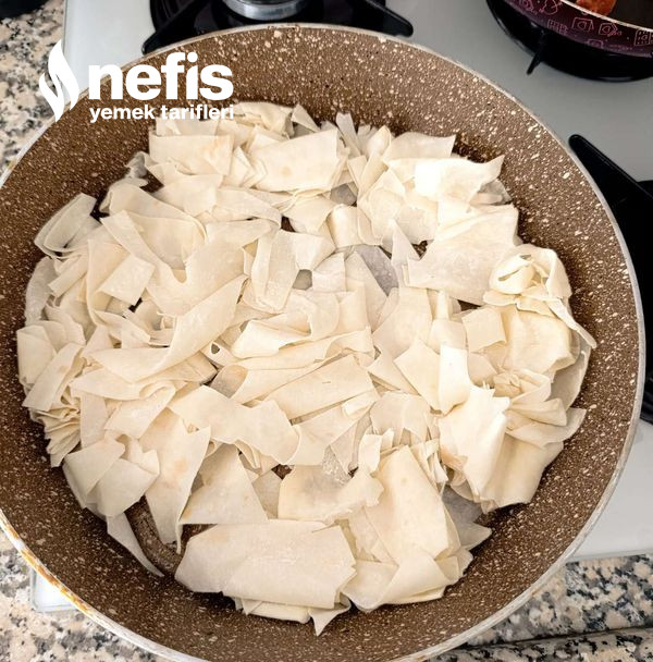 - Yufkamızı ince şeritler halinde kesip, yağladığımız tavaya yerleştiriyoruz.