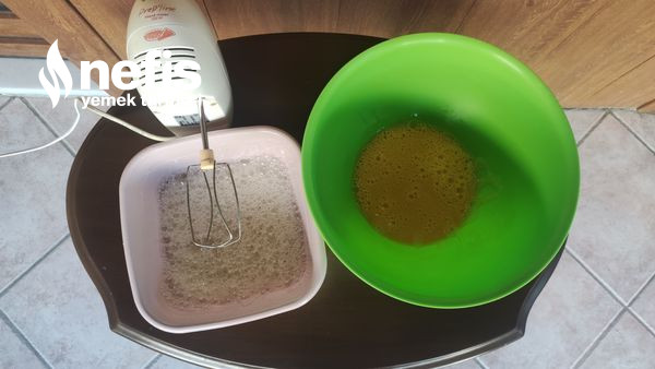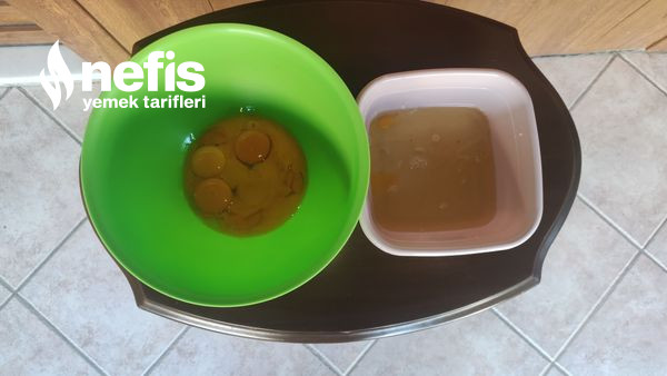 1. 4 adet yumurtayı sarısı ve beyazı başka olacak biçimde çırpıyoruz. Beyazı köpürünce birleştiriyoruz.