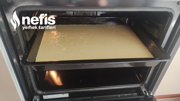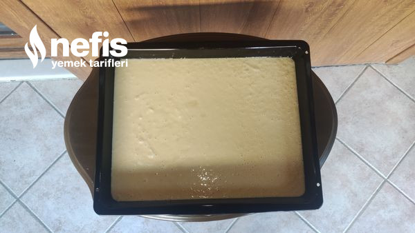 8. Kek harcını yağladığımız tepsiye döktükten sonra evvelce ısıtılmış 180° fırına koyuyoruz. Şayet tepside yapacaksanız yağlı kağıt da serebilirsizin altına.