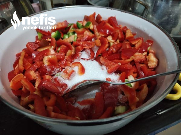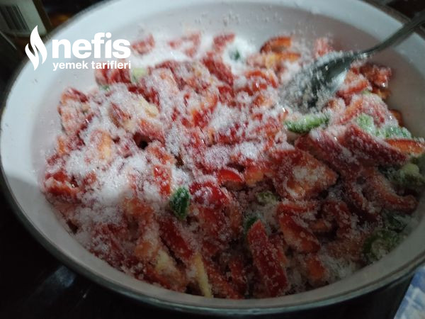 - Öncelikle biberleri yıkayıp ufak ufak doğrayalım ,üzeri şeker ilave edip bir gece bekletelim.Suyunu bırakana dek .
