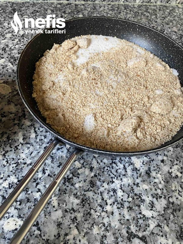 - Toz şeker, 3 yumurta beyaz ve toz bademi bir büyük tavada karıştırıyoruz.