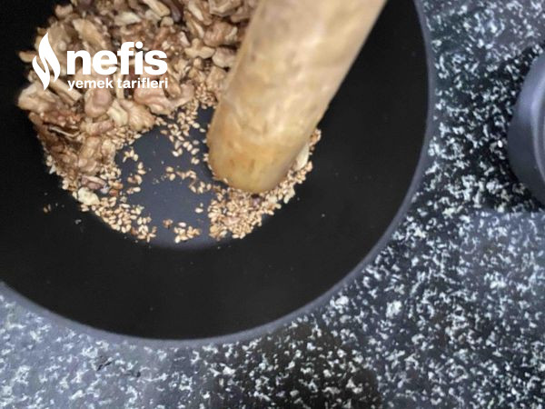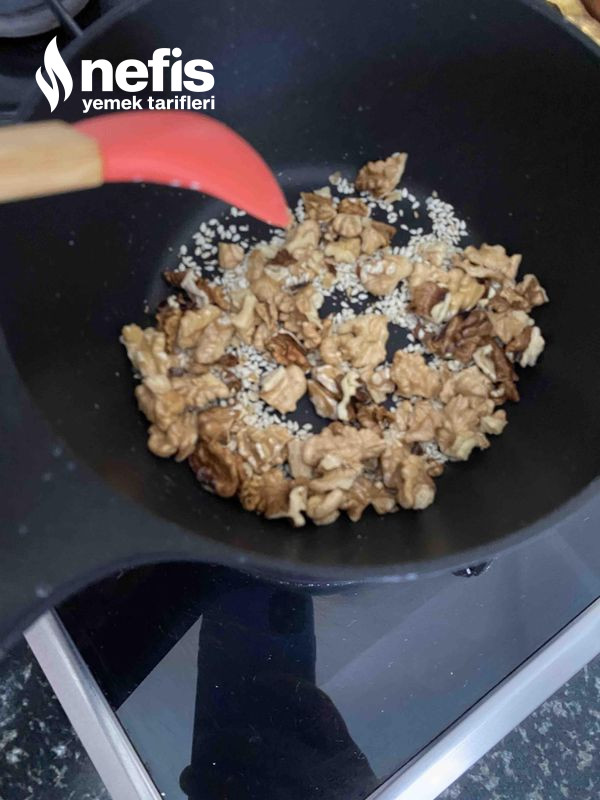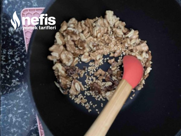 - Susam ve cevizler kısık ateşde kavrulacak. Soğuması için bekletelim hafif susamları ezelim daha hoş koku vermesi için ☺️.