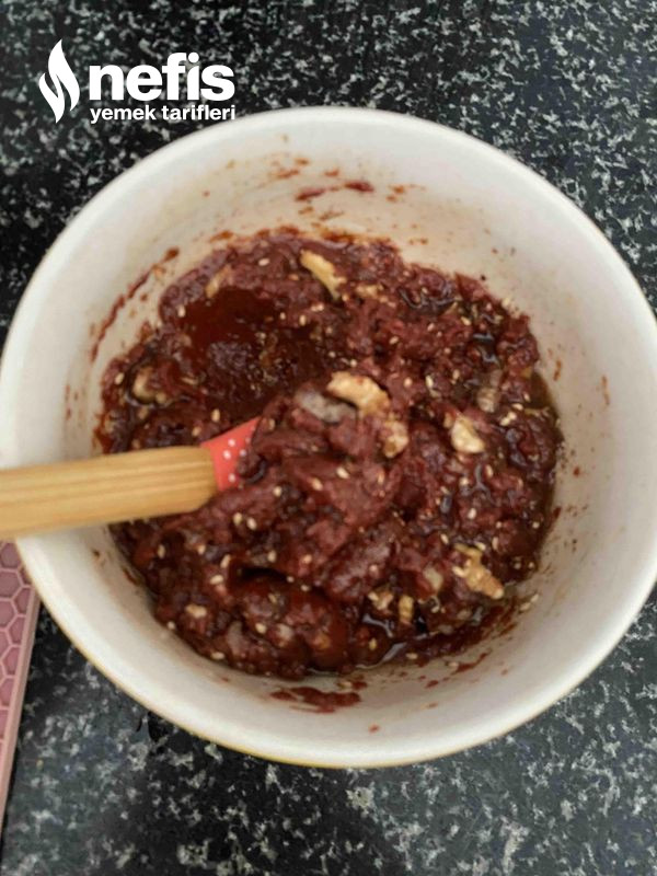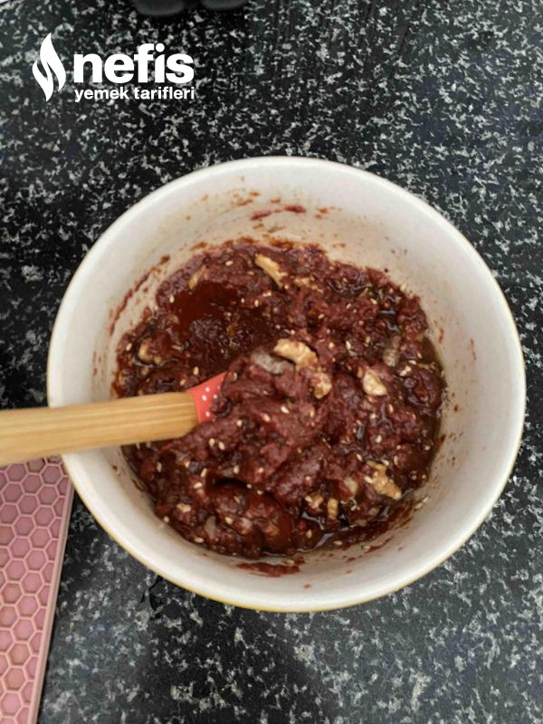 - Sarımsakları ezelim, içine salçamızı ve baharatları koyalım cevizleri ve zeytin yağını ek edelim hepsini karıştıralım. Afiyetle yiyelim.