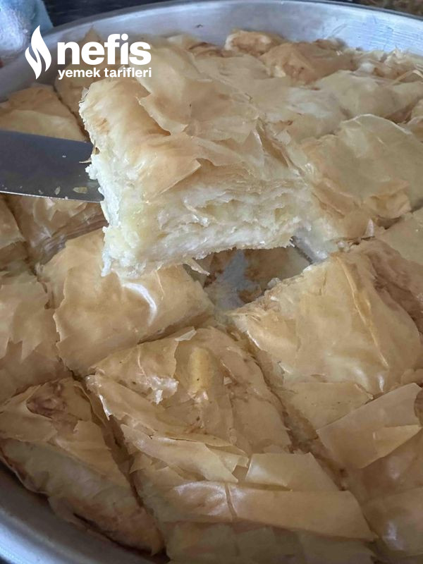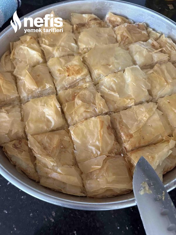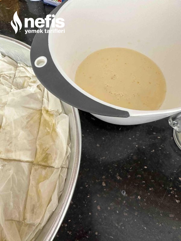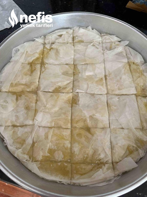 6. Daha sonra kalan kalan olağan yufkanın bir adedini tekrar tıpkı formda sosa batırıp tepsiye dizelim.