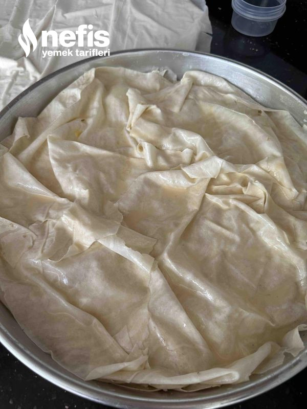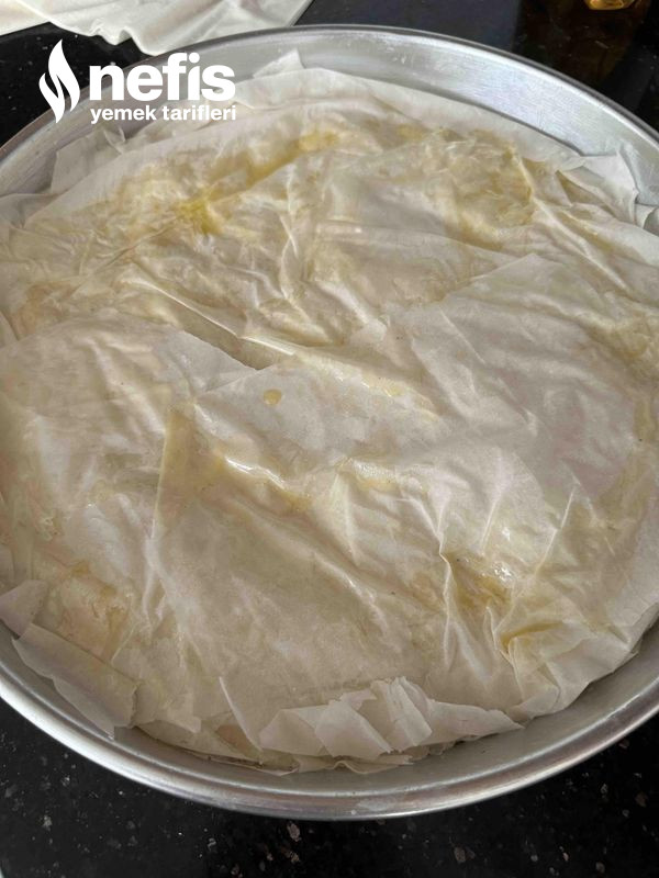 7. Daha sonra kalan baklava yufkalar tıpkı formda ortalarına yağ sürerek dizelim.