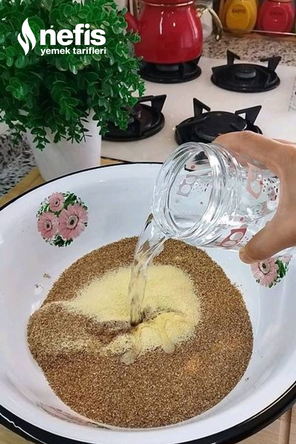 8. Hamuru için bulgur ve irmiği geniş bir kaba alıp üzerine su ekleyin.