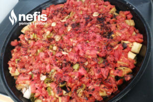 3. Son olarak üzerine domatesi yayalım ,üzerimi kaplayacak halde son olarak sıvı yağ üzerine kaşıkla azar azar gezdirelim.