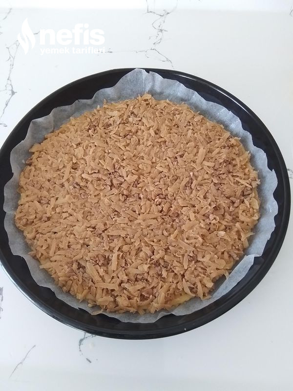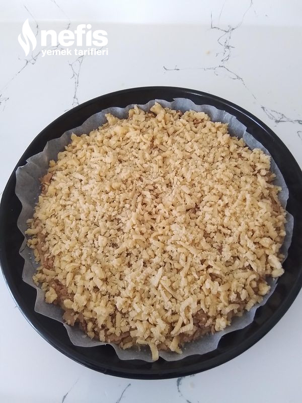 - Sonra buzlukta ki hamuru tartın üzerine rendeleyip serpin.