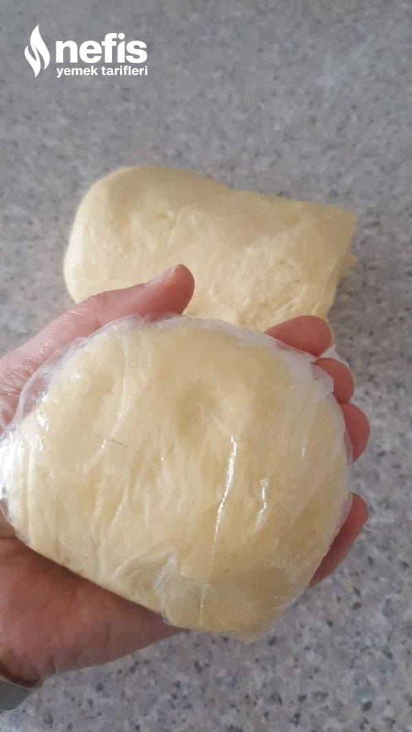 - Hamurun üçte birini poşete sarıp buzluğa ,diğer kısmınıda poşete sarıp olağan buzdolabında yarım saat kadar dinlendiriyoruz.