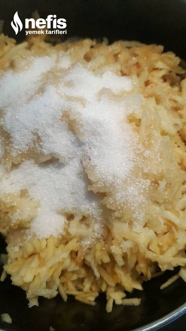 - Bu ortada tavaya soyup rendelediğimiz elmaları ve şekeri ekleyip suyunu çekene kadar pişiriyoruz.