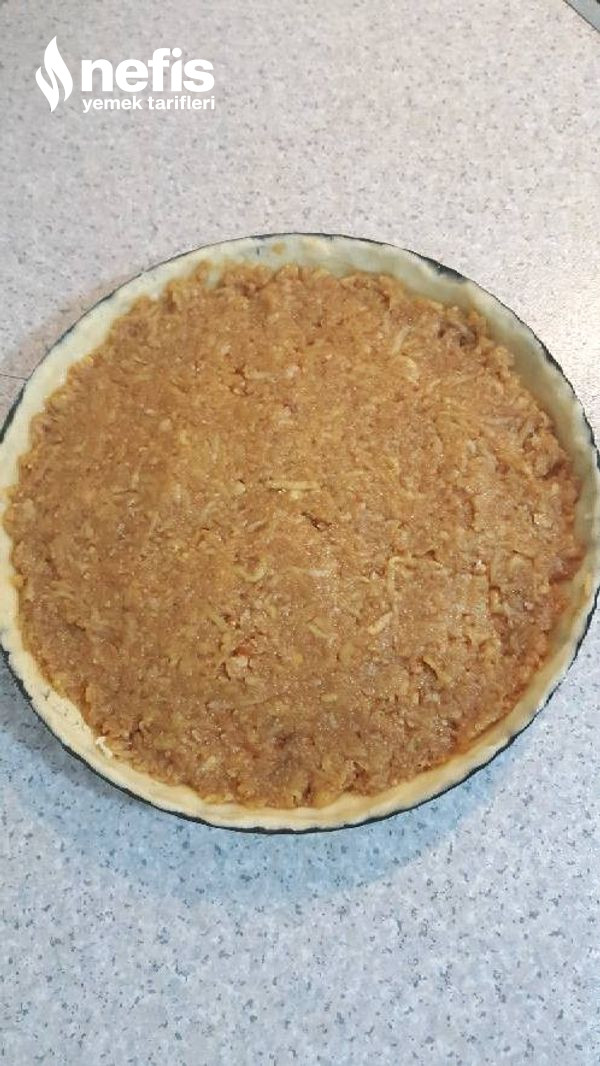 - Soğumuş olan elmalı harcı üzerine eşit bir formda yayıyoruz.