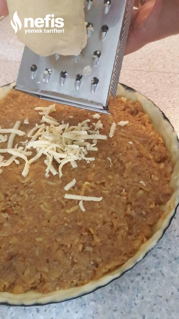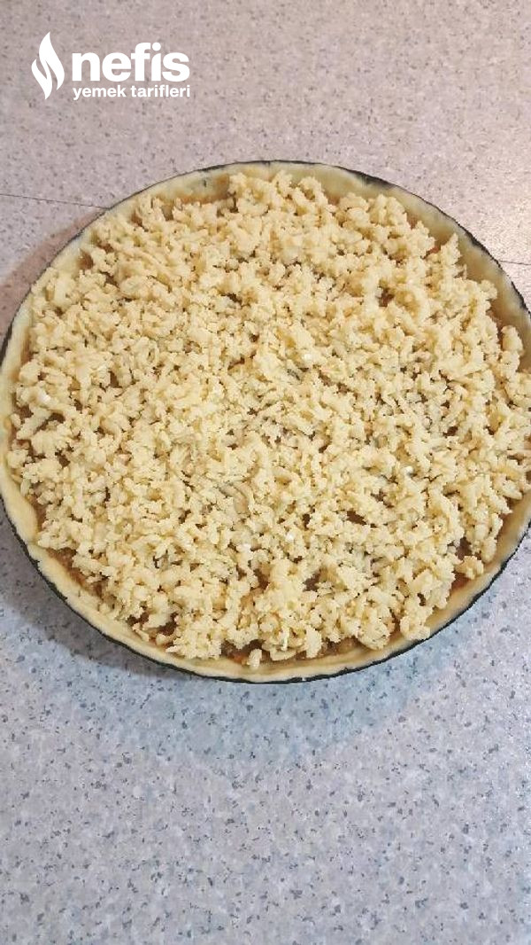 - Buzlukta beklettiğimiz hamuru elmalı harcın üzerine rendeliyoruz.