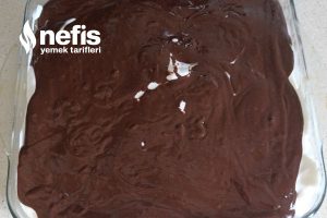 - Daha sonra buzluktan kremşantiyi alalım ve soğuyan kekin üzerine yayalım yeterlice hem kek ılık olacak hem sosta ılık olacak kekin üzerine dökelim ve sonra dolaba 2-3 saat soğumaya bırakalım afiyet olsun.