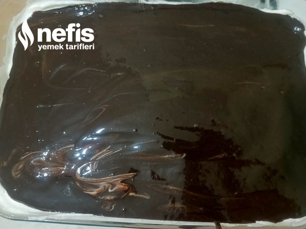 - Kek krem şanti çikolata sosu sırasıyla ekleyin.