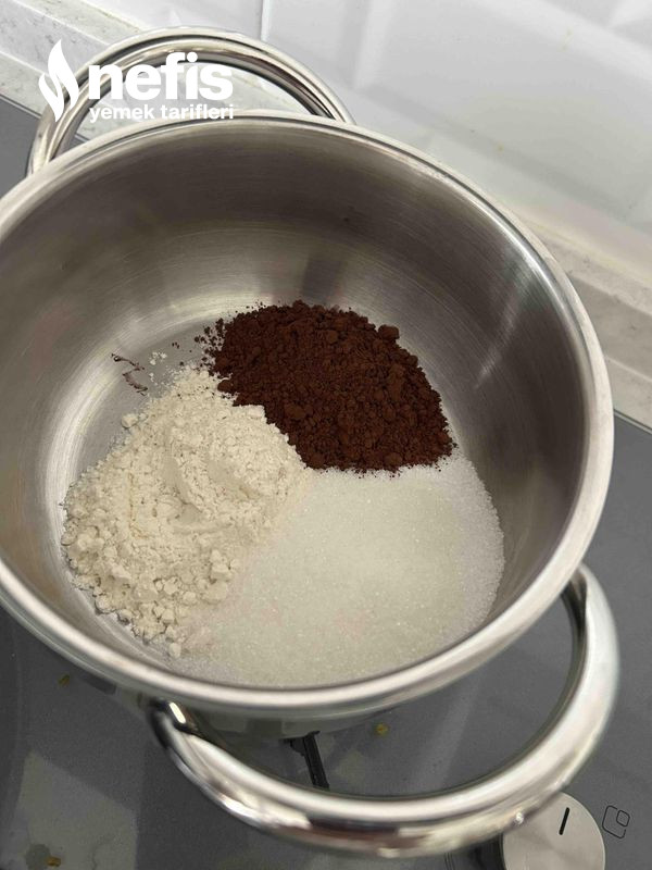 - Sonra kuru gereçleri un, kakao, kabartma tozu, ve vanilyayı eleyerek ekleyip spatula yardımıyla karıştıralım .