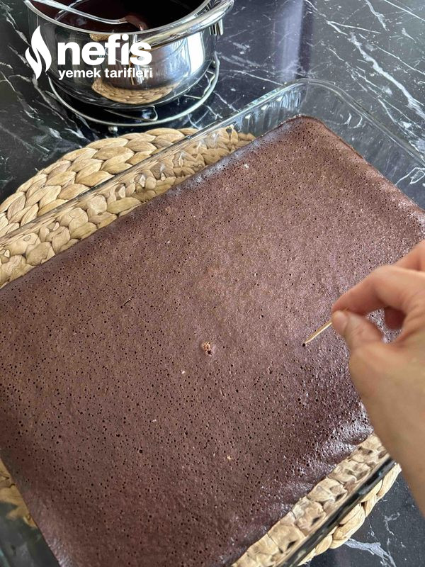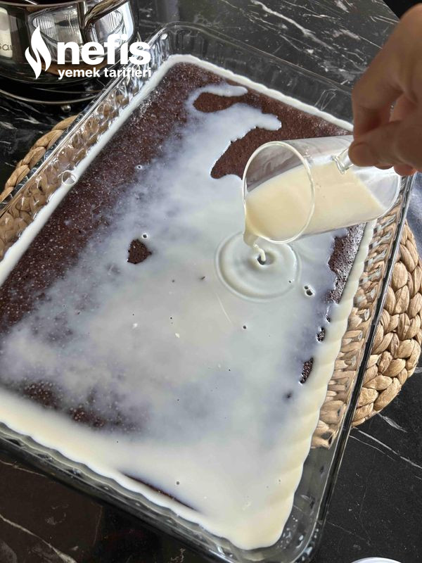 - Bu ortada pişen keki fırından çıkaralım kürdan ile delikler açalım birinci sıcaklığı çıktıktan sonra üzerine 2 bardak soğuk sütü gezdirelim ve yeterlice soğumaya bırakalım.
