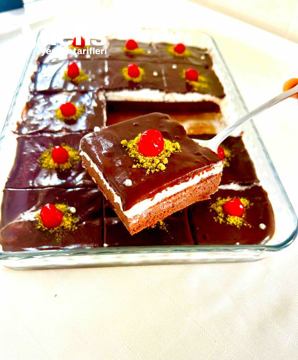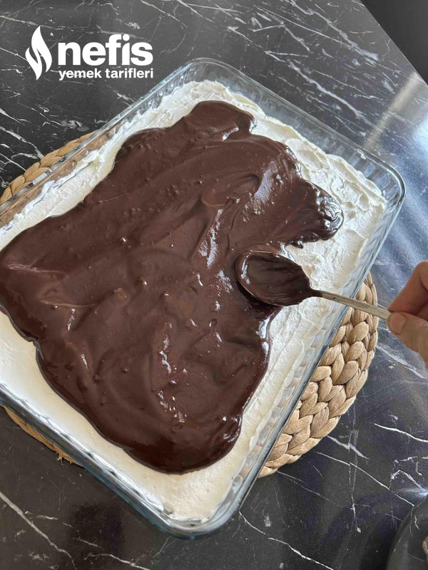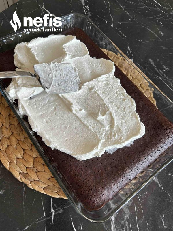 - Soğuyan kekin üzerine buzdolabında bekleyen krem şantiyi orantılı sıvayalım, öteki yanda yeterlice soğuyan kakaolu sosuda krem şantinin üzerine gezdirelim, büsbütün kakaolu sos ile kapatalım.