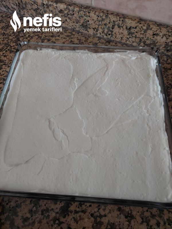 4. Hazırladığımız kremşantiyi kekin üzerine yayalım ve keki o biçimde buzdolabında 1-2 saat dinlenmeye bırakalım (kremşantiyi 1 çay bardağı süt ile çırpın benim açıkta kremşanti vardı kısaca 1,5 paket kremşanti kullandım)