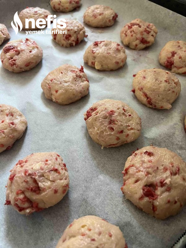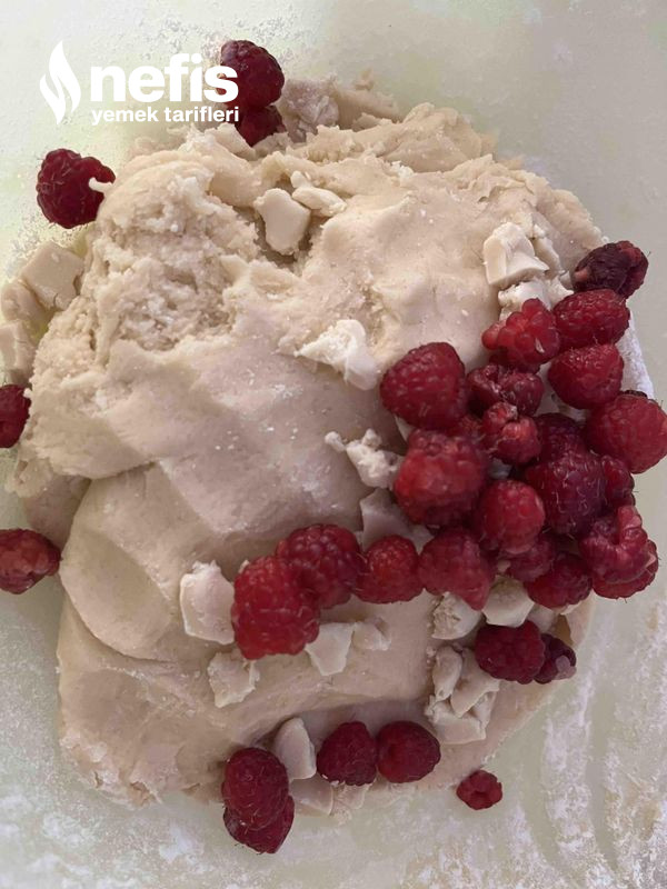 4. Hamurun içerisine küçük kesimlere böldüğümüz beyaz çikolata ve ahududular eklenir ve hamur hazırlanır.