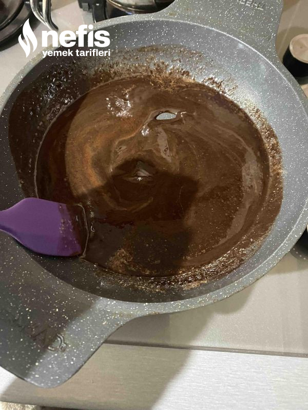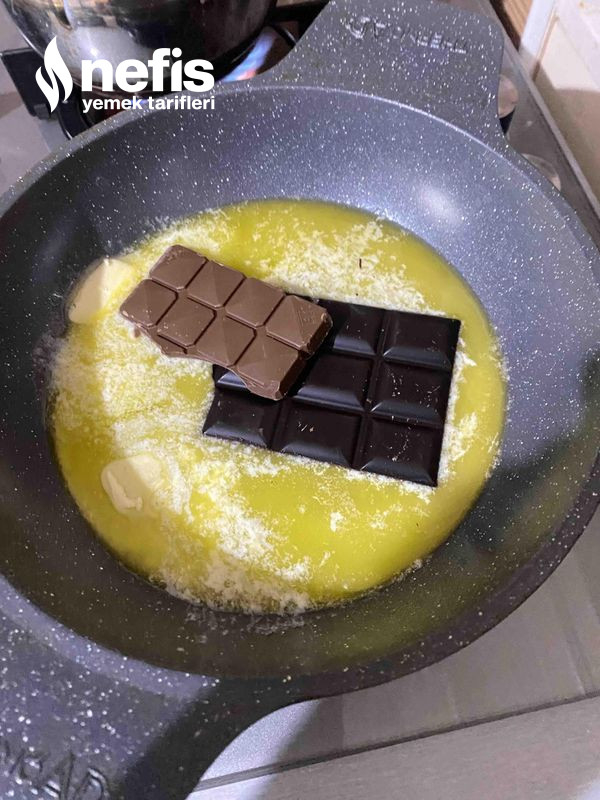 - Bir tavada kısık ateşte tereyağı eritilir, tereyağı eriyince üzerine çikolata eklenir ve tereyağı ile karıştırılır.