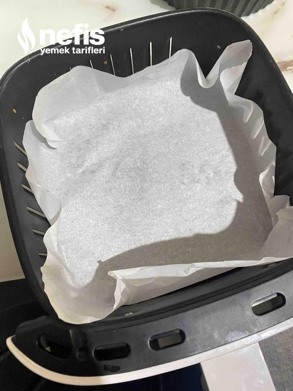 - Isıtılmış airfryer kabımıza yağlı kağıdımızı alıyoruz ve browni hamurumuzu döküyoruz.