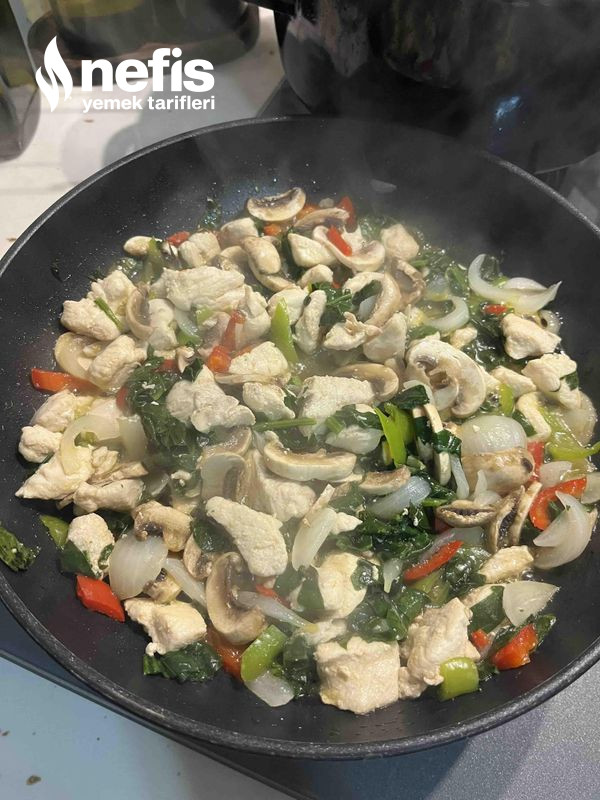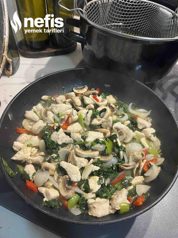 1. Tavuk göğsü kuşbaşı doğranıp, harlı ateşte suyu çekene kadar pişirilir.