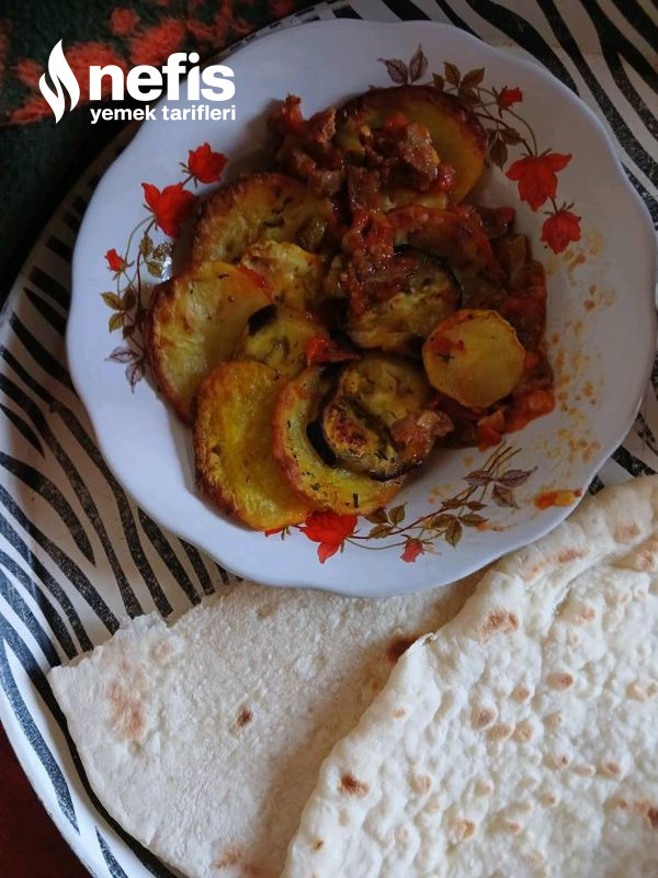 2. Biraz piştikten sonra kıymayı ekleyip hepsini bir arada kavuruyoruz, üzerine soyulmuş doğranmış domates ekleyip pişiriyoruz.