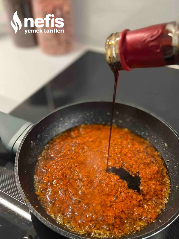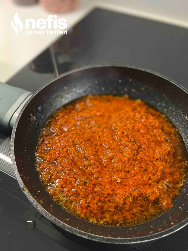 6. Küçük bir tavada zeytinyağı, rendelenmiş sarımsak, ajvar, nar ekşisi, sumak, kekik, kimyon, pul biber, tuz ve karabiberi karıştırın. Sos ağır ve aromatik bir kıvamda olmalı.