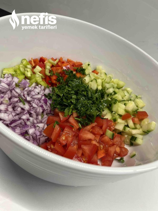 3. Kapya biberleri, yeşil biberi, kırmızı soğanı, domatesleri ve salatalığı küçük küpler halinde doğrayın.