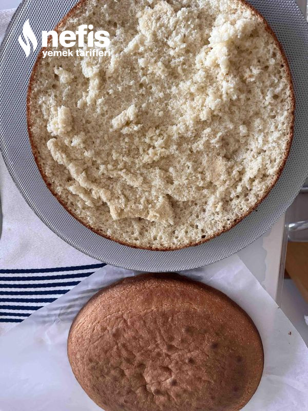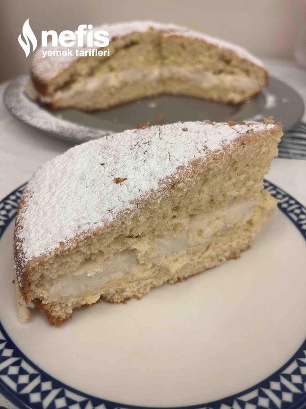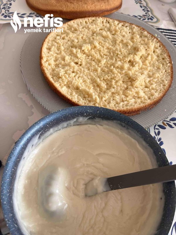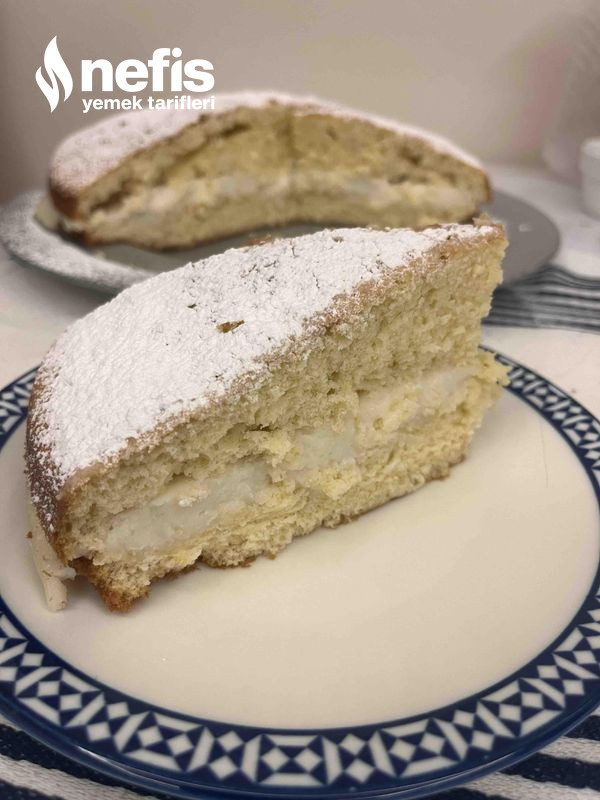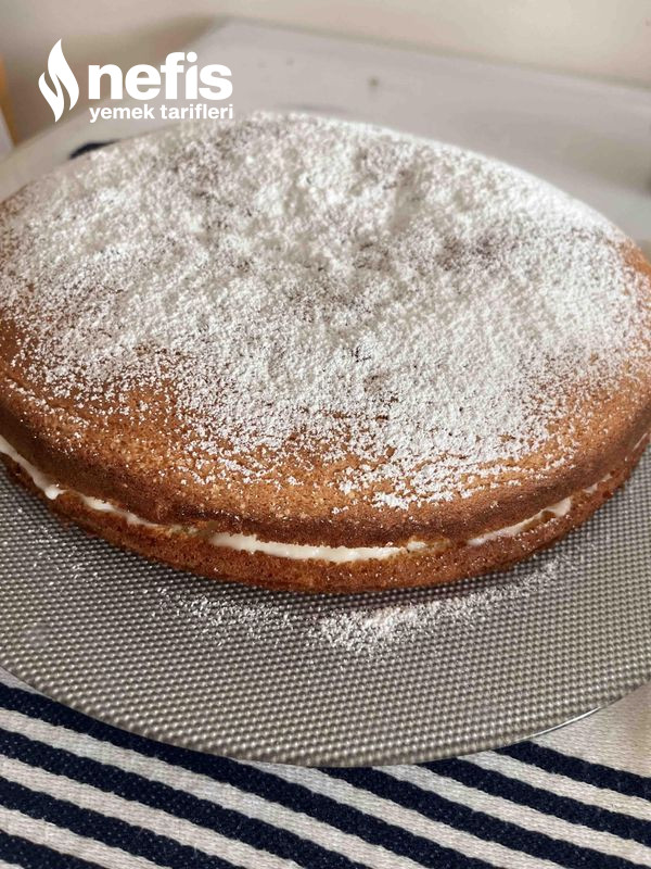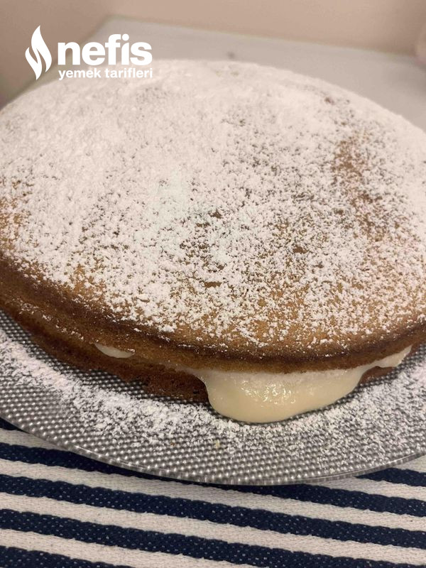 4. İkiye böldüğümüz kekin ortasına kremayı sürüyoruz. Üzerine başka parçayı karıştırıyoruz. Üzerine pudra şekeri döküp servis yapıyoruz, afiyet olsun….
