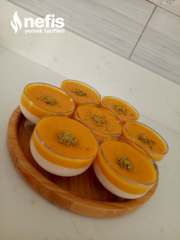 - Servis kaplarına evvel muhallebiyi dökün. Sonra üzerine hazırladığınız mango sosunu gezdirin.