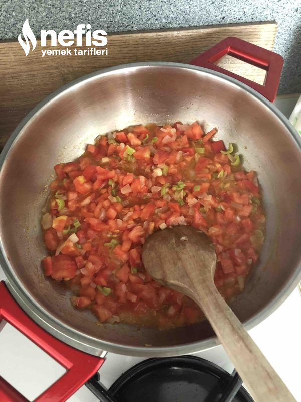 - Tencereye soğan ve biberi doğrayıp, kavurmaya yakın sarımsak ve minik doğranmış domatesi ekleyip karıştırın salça koyun karıştırın baharatları ekleyin karıştırın.