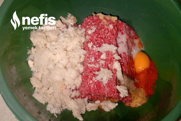 - Kıyma, yumurta, ekmek içi,galeta unu, baharatlar, rendelenmiş soğan ve sarımsağı bir kaba alıp güzelce yoğurun.