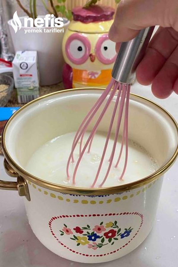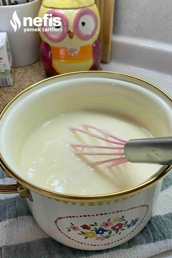 - Daha sonra krema yapıyoruz. Krema için labne hariç tüm gereçleri bir kap içerisinde alıp daima çırparak karıştıra karıştıra pişiriyoruz.